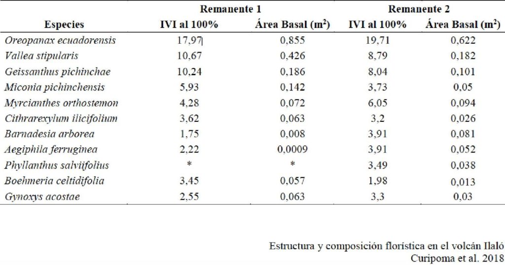 La especie dominante es el pumamaqui (Oreopanax ecuadorensis), que ayuda a mantener el nivel del agua en el suelo, y tiene usos medicinales. Esta misma especie tiene una gran importancia ecológica para el equilibrio dinámico de los remanentes de bosques que aún se mantienen en el Ilaló. Además, los autores identificaron 8 especies endémicas en peligro.