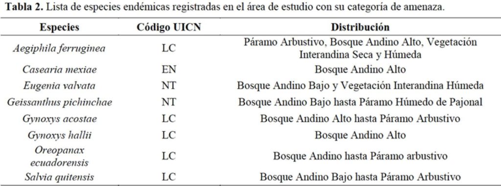 Se registraron dos especies de importancia ecológica e histórica en los remanentes de bosque nativo: Salvia quitensis, que es una de las siete especies endémicas para Quito; la otra, Myrcianthes rhopaloides, localizada en la parte alta del volcán Ilaló, conocida como “Huila o El Árbol del Señor”, que es un árbol patrimonial para la ciudad de Quito, debido a su antigüedad y su valor cultural.