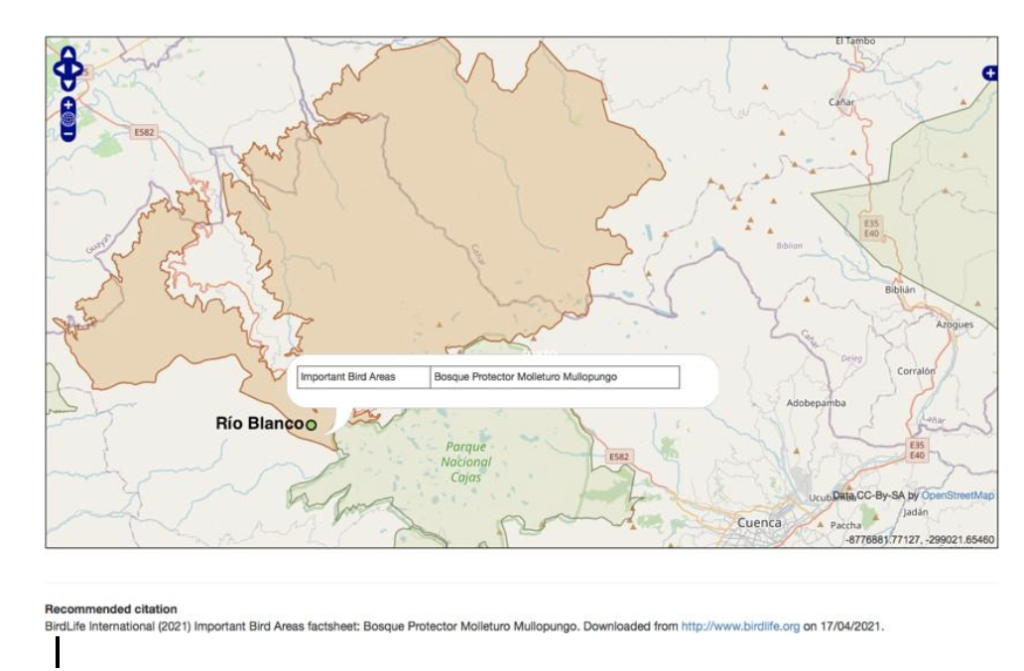 La comunidad de Río Blanco es parte del “Bosque Protector Molleturo-Mullopungo”, lo que le ha significado posicionarse un sitio estratégico para la observación de Aves. La extensión del bosque protector es de 150.000 hectáreas, se extiende desde la provincia de Cañar hasta colindar con el parque Nacional Cajas [7]01P.